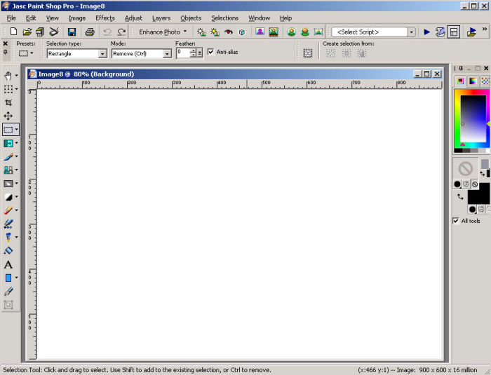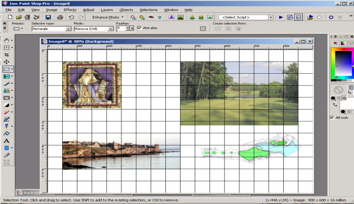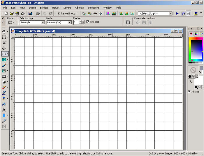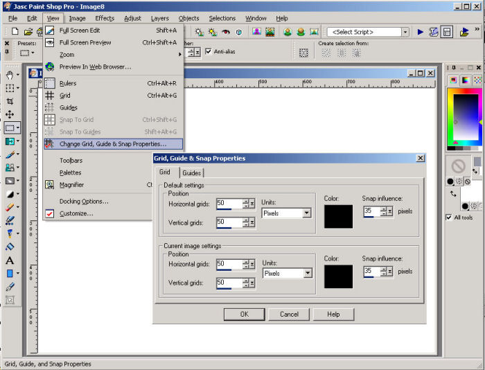 Preparing the Blank Image I like to use the PaintShop Pro "View Grid" option to assist in lining up the Front Side image data. A grid size of 50 pixels and a grid color of black serves my purposes for this example. The grid color may be changed based upon what is placed alongside the grid. The slection will "snap" to the grid if you have toggled the PaintShop Pro View/Snap to Grid option. Try this option and see how that works, if you have not already done so with PaintShop Pro. (Note: The area that you are "moving from" when you move a selection will be filled with the lower-color on the Material's panel. I prefer to have this color (during normal use) be white -- as images that I usually work with have a white background).
