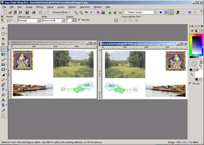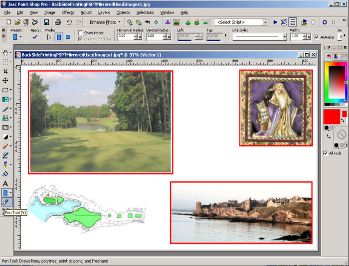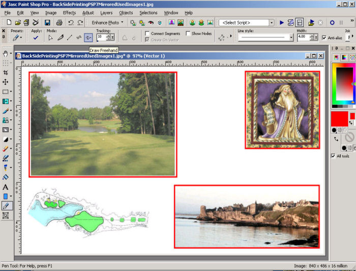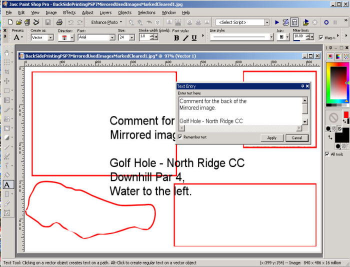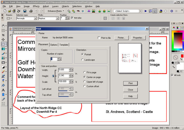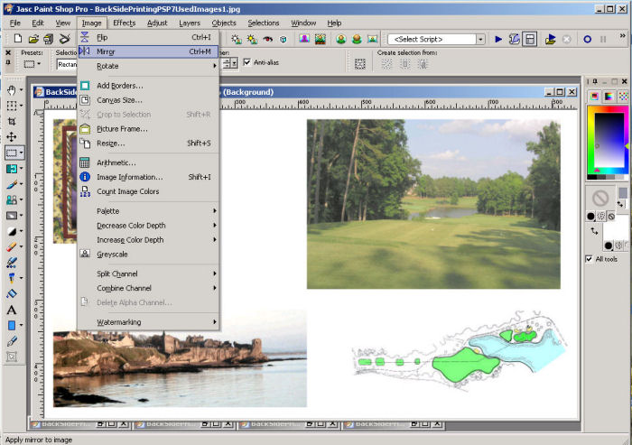 Mirror the image We save the image (File->SaveAs or shortcut F12). We could print this side -- but, in this example, we print at the end. After saving, we Mirror the image, using either the Image/Mirror pulldown or he shortcut CtrlM. This "mirroring" is just to give us a boundary for placing the data that we want on the back side of the previously set up/printed image.