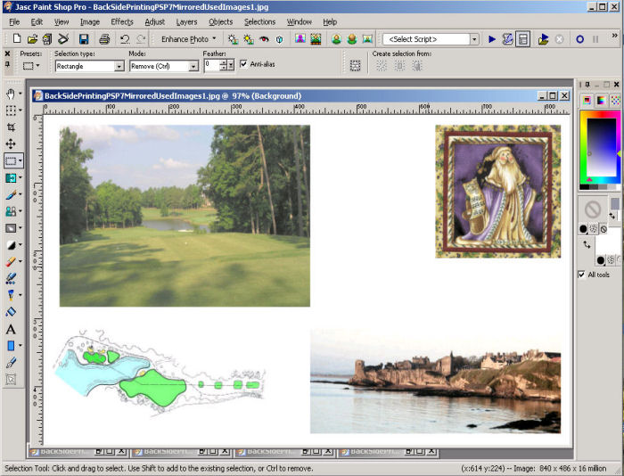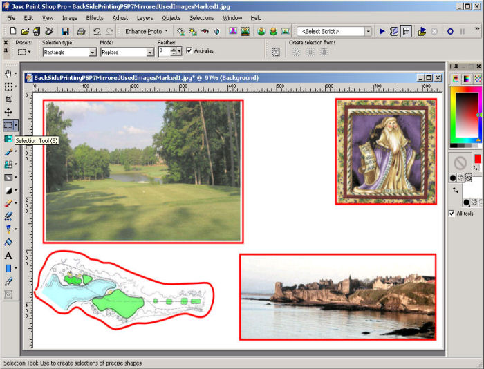 Images Are Placed on The Front Side Just, one image at a time, Edit/Copy and then use PaintShop Pro's Edit/Paste as New Selection within the Front Side Image. Move the image/selection to the grid as desired. The following shows the four images copied/pasted and positioned into the Front Side (previously-was-blank) space.