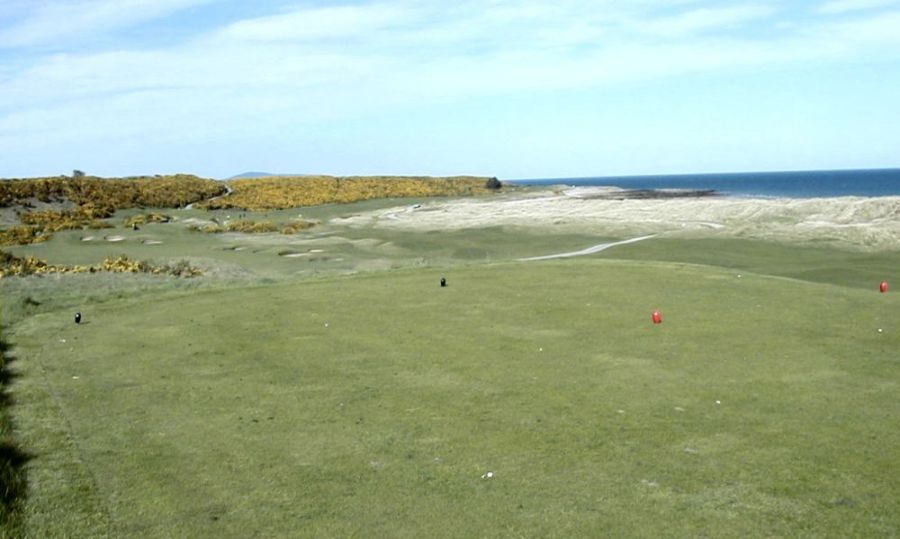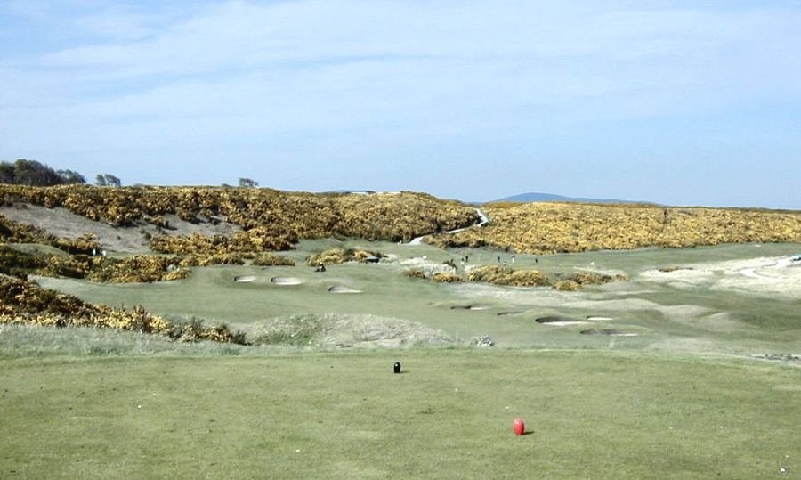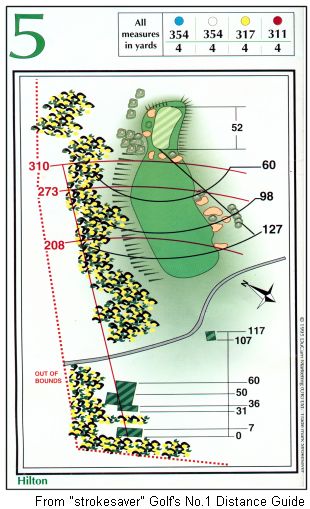 5th Hole - Hilton - Par 4 317 Yards A wonderful, short, par 4. After the drive, the second shot is to an elevated/mounded green that is difficult to hold. Greenside trap/"collection areas" capture any imprecise shot. You have to stay clear of the gorse and rough on the left -- and that is not easy as anything on the left side of the fairway will roll to the left. A difficult driving and second shot hole for players from the front tees. |