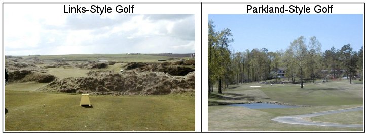 The shown-pictures give an indication of differing challenges faced by golf course designers. I appreciate both golfing environments
