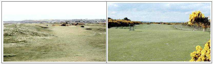 The St. Andrews example shows Springtime views of similar golf holes at two different golf courses -- located quite close together. One hole is in a in a traditional, beautiful/bare-looking links-golf setting while the other is in a setting of colorful gourse-in-bloom. Both shown golf holes are also 175 Yd Par 3s.