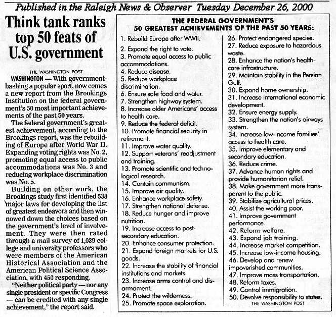 Give some thought, as you read the following, how you feel about the reported "Top 50 Feats of USA Government" and let me know your families' view of the top 50 feats of "The World" over the past fifty years. It may bring forward some interesting discussions.