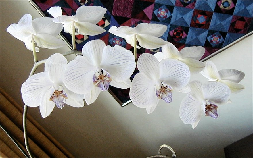 The orchids continue to come forth this year. We got lucky with one that has a maximum number of orchids-on-the-stem. (Nine - on this stem). It is very beautiful in real life -- and not bad in the following image!