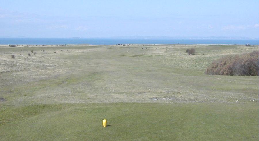From the "top of Gullane hill" tee location, a nice drive will result in a second shot that needs to be slightly right to miss fairway bunkers that protect the second-shot landing area short of the green.