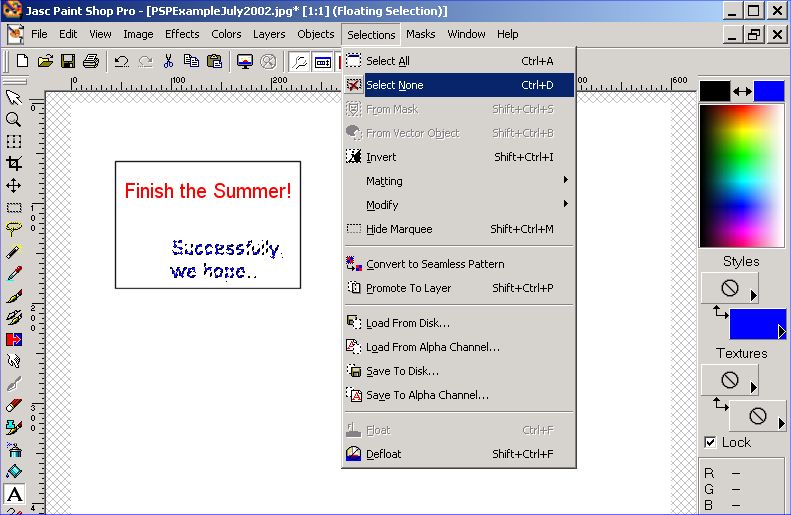 The text we have added is a "Selection" in PaintShop Pro. While a selection, we could (for example) move the text. Or delete the selection if we are not satisfied. We choose to "un-select" the text after we have the desired information and placement of that information.