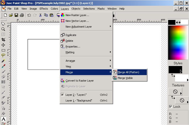 PaintShop Pro has a "layer" concept. The preset shape you have added has been placed in its own layer. For this example, we merge the layers. As your experience with PaintShop Pro grows, you will no doubt take advantage of the "layer" feature.