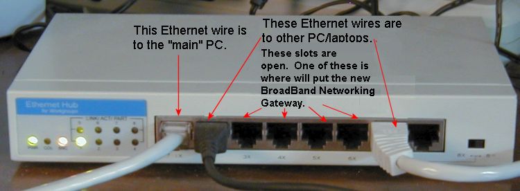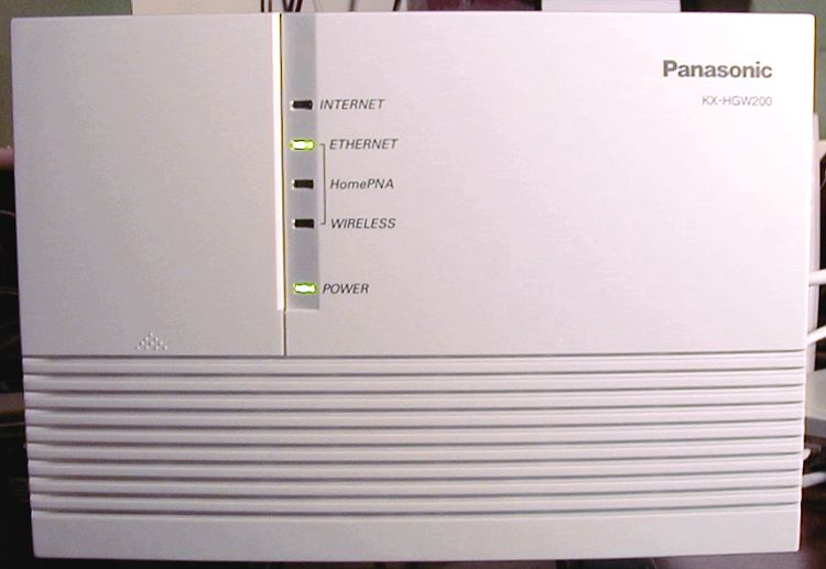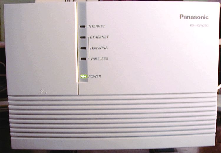 The Networking Gateway I used is a Panasonic Broadband Networking Gateway model KX-HGW200. It cost about $50 USA (on sale). It comes with an Ethernet cable that in my case is connected from the Networking Gateway to my Ethernet Hub into one of the above-shown open ports. It also comes with a phone wire/connector for connecting to any wall phone slot.