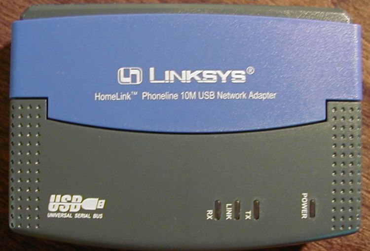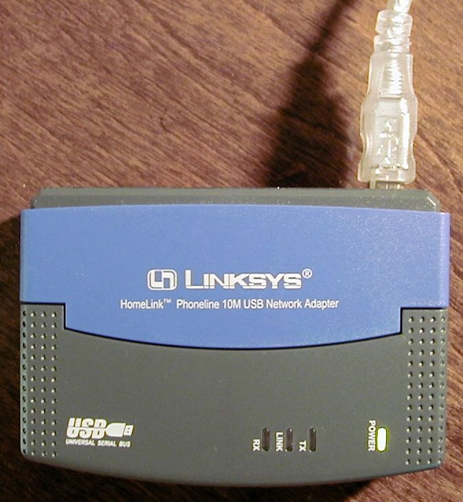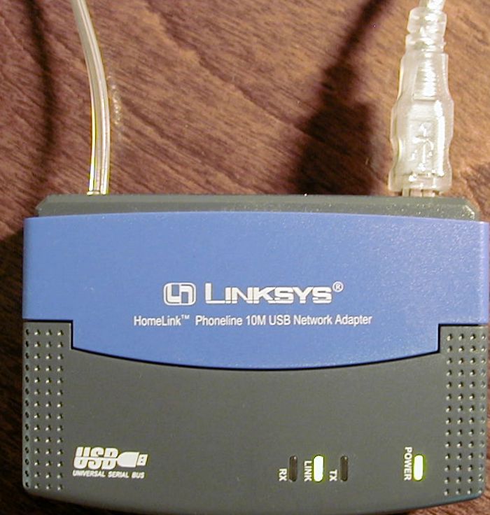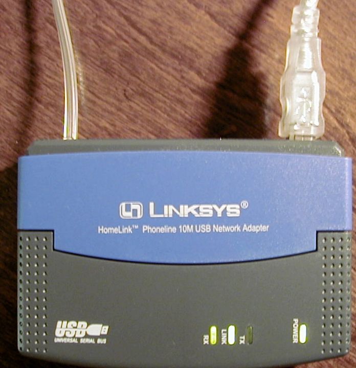 We can do that using the following. We purchased a Linksys Homelink PhoneLine 10M USB Network Adapter.