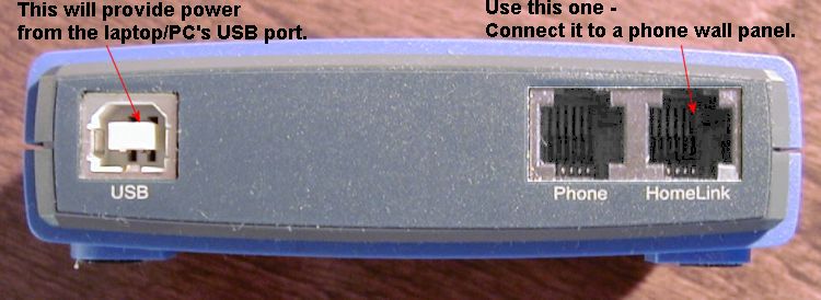 The back of the USB Network Connector is where the cables go. I did not use the Phone connector -- that is for a "real" phone. I use the HomeLink connector with a phone wire into a wall phone panel.