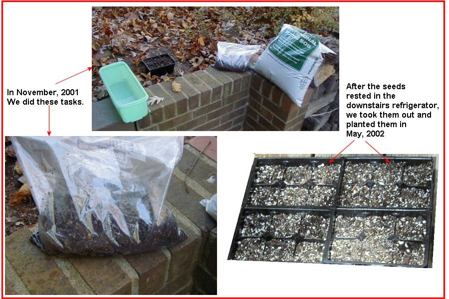 First, we selected a number of Dogwood berries in October/November 2001 and placed them in moist potting soil -- in a plastic bag -- and, then placed the bag into the refrigerator for a few months.
