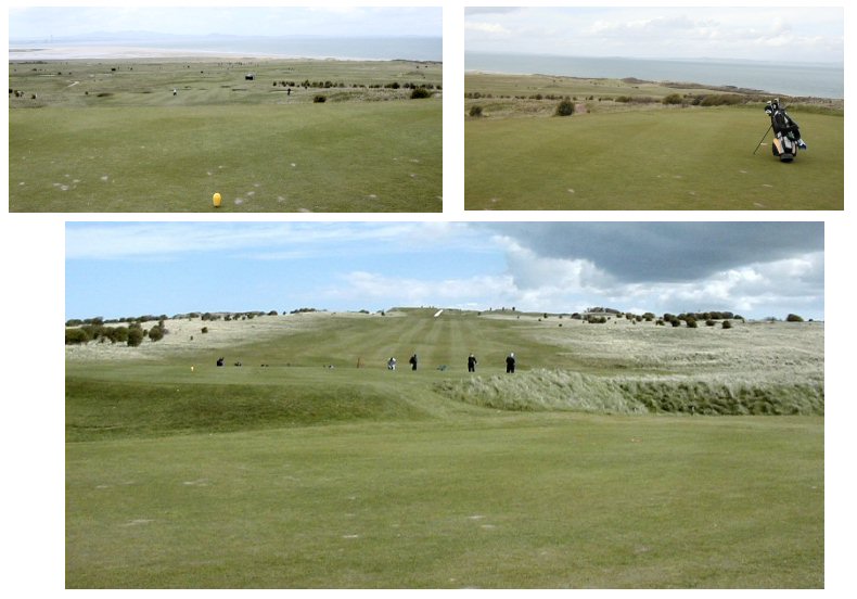 The top-left picture below shows the tee-shot view down the hill. The top-right is the player's view if he or she looks out to sea.
