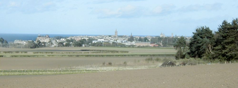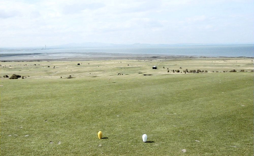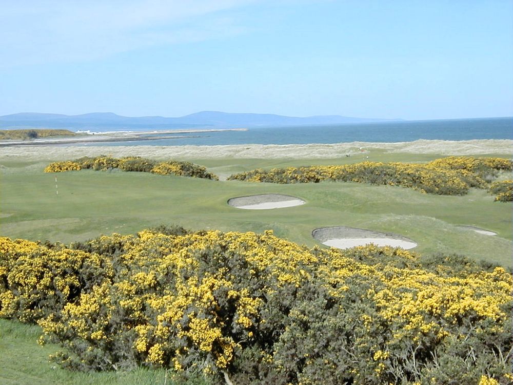 The place where the picture (above) was taken was from Gullane's Golf Course #1, the 7th tee. There are three golf courses at Gullane: #1, #2, and #3. From the 7th tee, if you turn around and look over your shoulder, the course you see in the background is Muirfield (where the British Open will be held in July, 2002).