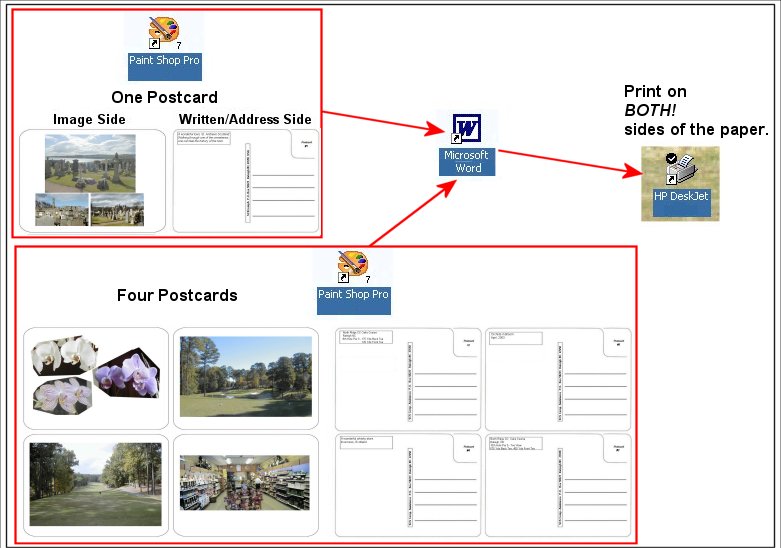 When I started this example -- awhile ago -- I thought it would be easy. It turns out that making a single postcard per printed page was quite straight forward. After that straight-forward example, I tried to print four postcards per printed-page -- and that was more difficult to do than I expected. What was the difficulty? Lining up the back side of the postcard onto the front side!