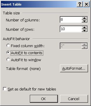 Since we asked to auto fit the cell size, the table shows at the beginning very small cells! No problem. We will fill in the information we want within a particular cell (such as first names in cell one of a row, last names in cell two, and so on.