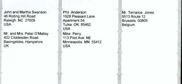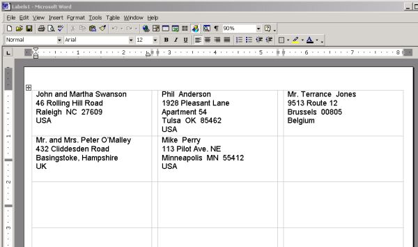 Word merges the information into the New document and it is presented to you as shown -- in a format that fits your label you previously chose (Avery 8160 in this example).