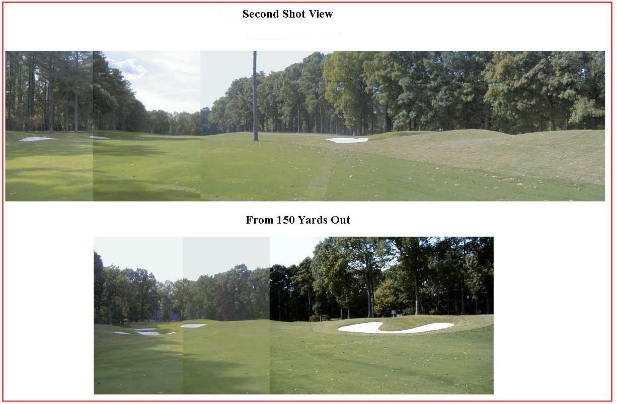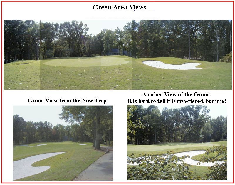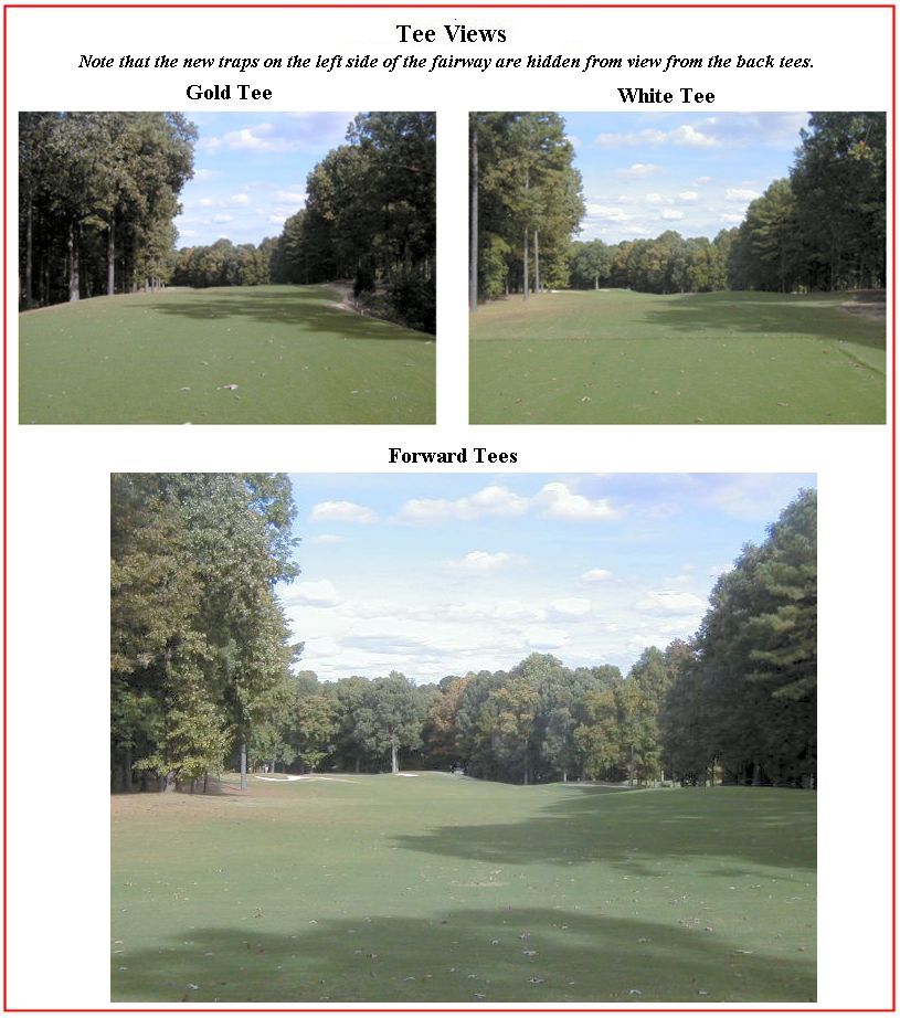 The tees have been enlarged and the total length of the hole has been lengthened. New traps have been added at both the left-side drive landing areas and in the second shot landing areas. The green was also enlarged and made into a two-tier green with a severe "gully" on the left side of the green.