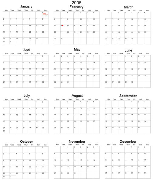 Individual Month (Clicking on a particular month will bring forward a larger-sized image of that month. Save the shown-image and modify it, adding any text you may want for individul days, and then insert it into the Month's Page Template using your image-processing application (for example, PaintShop Pro).