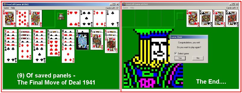 Note: If you are running your PC on Windows 98, it is possible you have to specifically install FreeCell. Just install Accessories/Games. Let me know if these FreeCell games and the number of times we had to restart to solve the deal is about what you find. If you are going to attack deals 1-to-32000 and want to interact with us in that regard, let me know what thousand-or-so you are going to start with. We have completed deals through 2000. Now, we are attacking 2001-to-3000 and I would recommend you start with 3001! At the rate we are going (a little more than 100 deals a month) it will only take us 22 more years to complete the 32000 deals without your help. If you let us know what you have completed, it will take us less time! I am adding to this column in the newsletter a few "special" games that we found during the month. Note: I will update this material by the end of business day May 20, 2002.