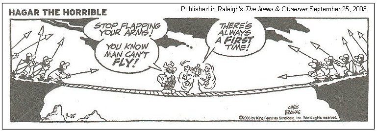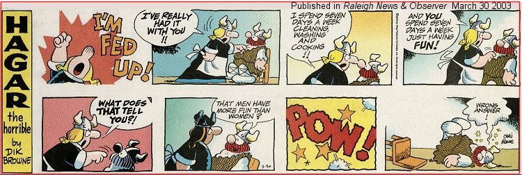 Let's begin, as usual, the newsletter with a couple of scanned (I use a Microtek ScanMaker V6upl) comics. (I show these as a sample of scanning material and using the results of the scanning process. The scanned image has been adjusted with PaintShop Pro. For example, the scanned material ends up in the computer with a "grayness" the color of the newspaper and PaintShop Pro is used to "swap" that color with "white". Also, writing on a scanned image is shown. Your home computer system's image-processing application may be used to do similar functions).