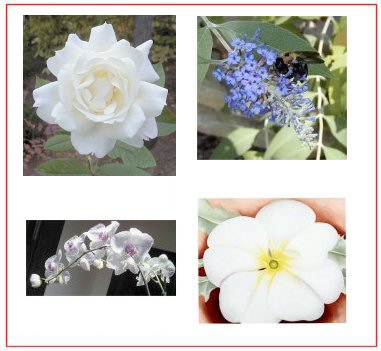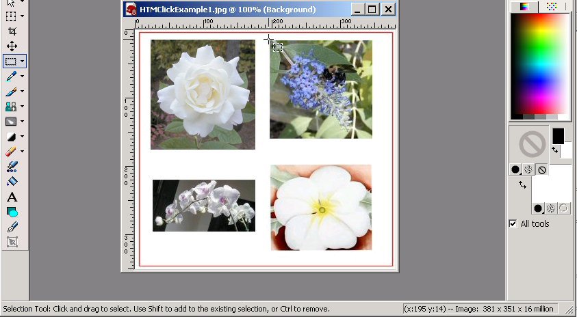 OK! We have our four areas that will be clickable for this image. Here is how we describe these using HTM. First, we tell the Web browser that we are going to "map" parts of the displayed image. We do this by adding a parameter to the previously-shown IMG statement. The IMG statement now is: ("thisexample" is just a name -- and a "map" parameter is always preceded by a "#". Why? Just do it... Don't ask why!) The "thisexample" only needs to be a name found later in the HTM tags. < p align=center > < IMG SRC="./HTMClickExample1.jpg" usemap="#thisexample" > We then define the "thisexample" map statements -- and tell the Web browser what to do when the clicking occurs. (We do not need the "#". Why not? We just, don't need it! HTM is sometimes confusing, I know -- but, anyway: We don't need/use the # on the map name.) < map name="thisexample" > < area shape=rect coords="24,23,174,175" href="./RoseOctober2003.jpg" > The above shows the first-clickable area and the operation of the Web browser when that area is clicked is to show another JPG. This is a common thing to do -- click on one part of an image and, in turn, show another image (normally a larger/more-detailed format of the clickable part). Next, we define the other three clickable parts. < area shape=rect coords="195,14,345,158" href="./BeeJuly2003.jpg" >