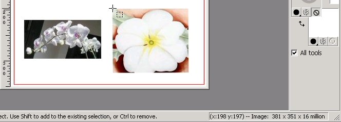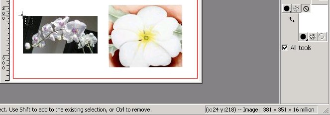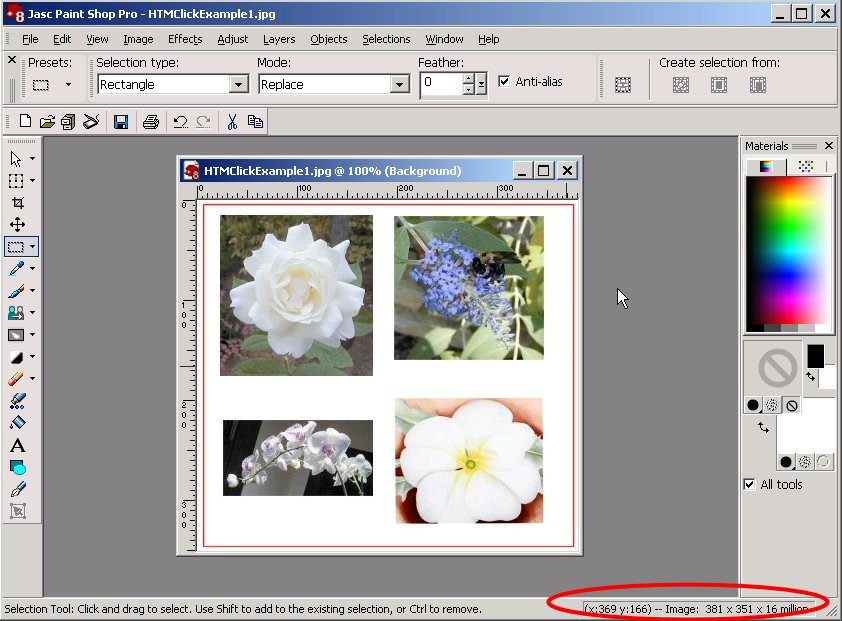 First, we need to decide what parts of the image to make clickable. In the above case, we can (obviously!) choose to use the four parts of the shown-image. Since we are going to make a part clickable -- we need to know the "address" of the clickable part. By address, I mean something that we can describe to HTM and, through that - to the computer's mouse and to your Web browser. One way could do this is to use PaintShop Pro or some similar image processing application. I use PaintShop Pro; if you do not, your image processing application may have similar support. I bring the image to be evaluated into PaintShop Pro. Once there, I pay attention the information shown in the lower-right part of the PaintShop Pro, the "(x:369 y:166) -- Image 381 x 351 x 16 million" part of the panel.