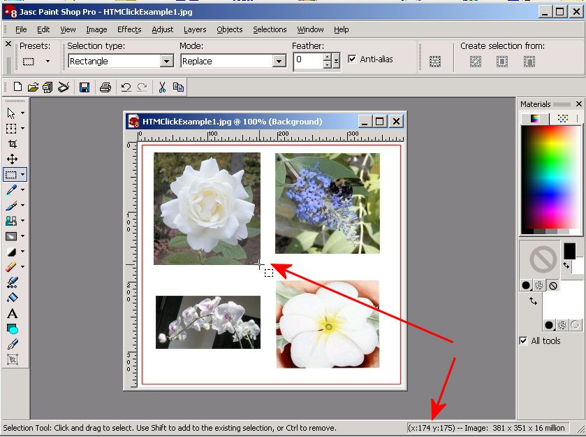 I next do the same for an opposite boundary of the to-be-clickable part of the image. Again, I make note of these values, "174,175", and I will use these as the other description of the clickable area. The clickable area will be described in HTM as "24,23,174,175". We will use this information in an HTM tag.