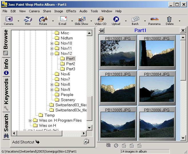 The other application, JASC Photo Album, I purchased for $30 this summer from the PaintShop Pro developers. Again, I am using the product as primarily for screen show purposes. There are other reasons for using Photo Album than screen show as is indicated by the buttons on the following overview panel.