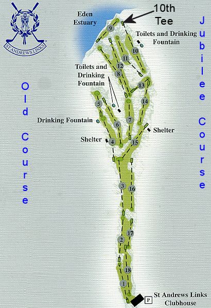 I find it hard to believe that I did not take a photo of the Jubilee nor the estuary.... but, I will someday and add those photos here. In the meantime, this is a scanned image from the "St. Andrews Links The New Course" scorecard showing the New Course layout and where you are as you begin the Back Nine of the New.